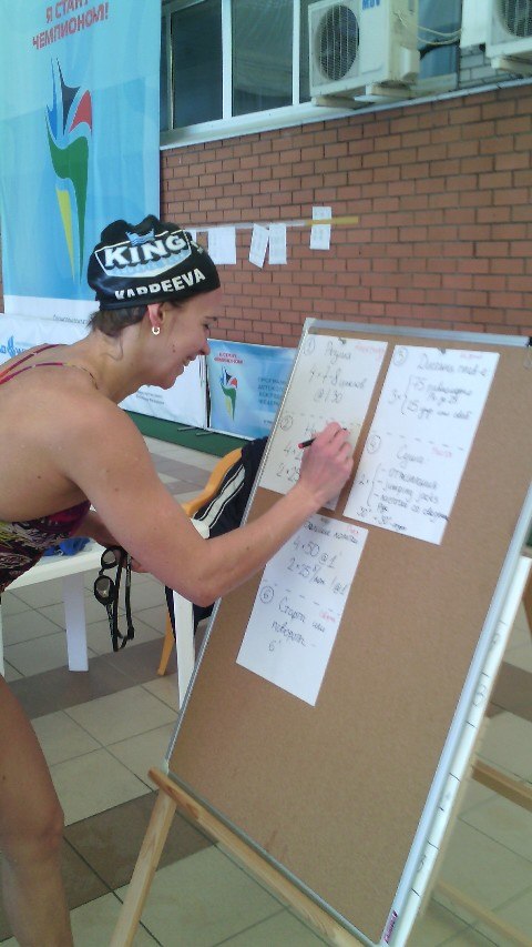 Для начала, после разминки, проплыли 50м. своим стилем на время со старта.